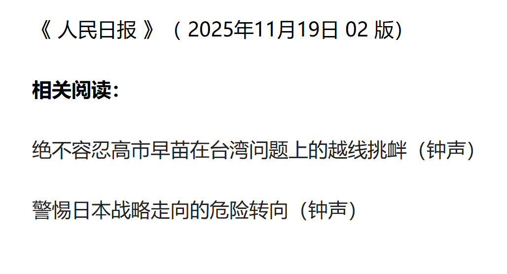 原标题:毒化中日关系必将自食恶果(钟声)2025年11月19日06:36 | 来源:人民网-人民日报小字号日本首相高市早苗公然鼓吹武力介入台海的可能性,粗暴干涉中国内政,且不思悔改,拒不撤回有关错误言论。这一行径严重违背一个中国原则和中日四个政治文件精神,严重破坏中日关系政治基础,严重伤害中国人民感情。个别日本政客声称中方对高市早苗涉台错误言论“反应过度”,这完全是对中方