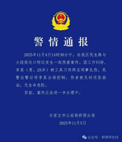 11月4日下午,一则关于石家庄外卖骑手持刀伤人的消息在多个社交群组中被频繁转发,引发广泛关注。视频显示在两位站长的语言刺激下,一位骑手与两位站长产生激烈的语言冲突,在站长开始动手的时候,该骑手持刀捅伤了两名站长。与网络上的热议形成鲜明对比的是,事发现场早已恢复了生活秩序,平静的略显不正常——该站点骑手仍在正常接单配送,而在他们聚集等单的区域,甚至还有人正在发