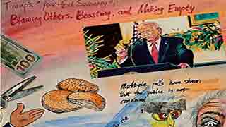 图、文|李公明开栏小语:涂鸦小分队的人有一句口号: 画什么才重要!怎么画和画成什么,没那么重要!图一特朗普的“年终总结”:甩锅、吹嘘、画饼 纸本彩墨 + 拼贴65cm X 45cm李公明 作 2025年12月20日据“澎湃新闻·全球速报”报道(2025-12-18),美国总统特朗普17日晚在白宫发表全国讲话,宣扬第二任期近一年来