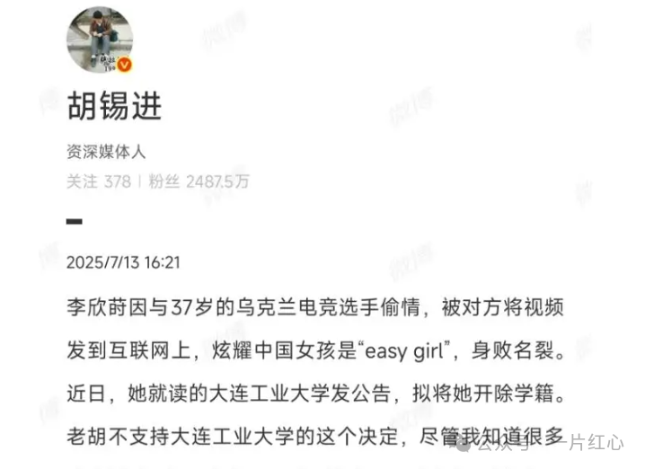 胡叼盘在谈大连工业大学学生李某某与乌克兰电竞选手偷情的事情时,费尽心思地堆砌文字,输出了一堆有害言论,妄图给网友洗脑,混淆是非。 胡叼盘认为李某某只是做错了,让她的父母蒙羞了,影响了校誉,但说她的行为有损国格,这就非常值得商榷。 接着,胡叼盘笔锋一转,说出他最核心的观点“一个女生与外国已婚男人偷情就有损国格了?这个认知和定性极不严肃”。 抛出这个观点