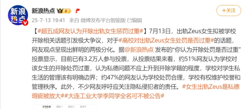 “新浪热点”做的调查显示,51%的投票者反对大连工大开除李某某,47%的人支持开除。“反对和支持大连工大决定的都有很多,但是支持者也非常多”,于是资深媒体人胡某某敏锐地嗅到了机会,“舆论在这个问题上发生了分裂”,于是乎他再次挺起胸脯,大声质问--- 女大学生李某有其李某某之私之德之私德,但她还有女人之德、女性之德、汉族女性之德、中国女性