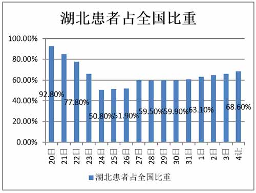 新冠疫情2月4日数据分析(数据来自国家卫健委公告) 直接说说重点吧。 与2月1日一样,昨天又一次出现湖北省新增病例猛增,导致虽然外省数据下降,但新增病例总体明显上升的情况。 昨天湖北新增患者增加3256人,增速扩大到34.6%。仅湖北新增患者比前天多出的人(911),竟然就比其他30个省市全部新增患者加起来(731)还多四分之一!全国每增加5个新增新冠患者,已经有4个来自湖北! 湖