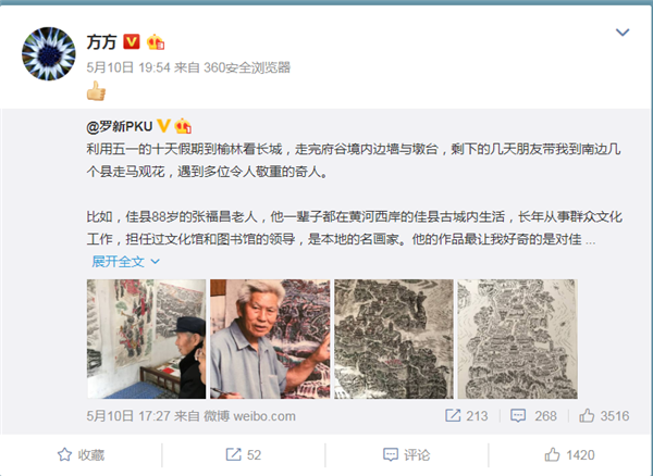 2020年5月10日 19:54 ,被网友戏称为带货大王的 @方方又在继续奋斗,她转发了 @罗新PKU 的微博并点上了一个大大的赞。 这个 @罗新PKU 的原微博本来记述的是他五一十天假期到榆林看长城,欣赏到了本地名家张福昌老人画的佳县(葭州)古城作品,最后不忘批判一下——“映照了现实佳县古城的拥挤、肮脏、缺乏美感”,按理说也没有太大问题。 只不过通过方方的这